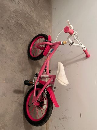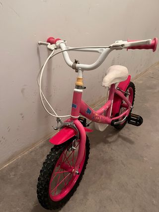 Bicicleta infantil, comprada en decathlon, ideal para niñas de 3 a 5 años. - Cadena protegida con cubre cadena. - Ruedines de apoyo incluidos. - Pedales y guardabarros en color rosa. - Diseño con personaje animado en el cubre cadena.