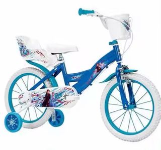 Bicicleta infantil con temática de Frozen, ideal para niñas de 5 años. Cuenta con un diseño divertido y colorido. - Ruedines de apoyo incluidos. - Cesta delantera. - Asiento trasero. - Diseño inspirado en Frozen.