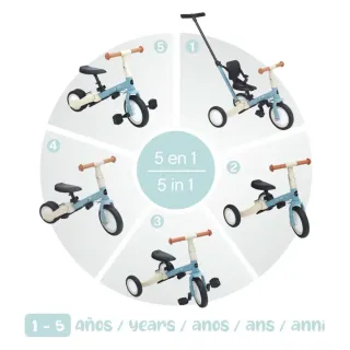 Triciclo evolutivo con múltiples configuraciones para acompañar el crecimiento del niño. - Diseñado para edades de 1 a 5 años. - Configurable en 5 modos diferentes. - Estructura en tonos azul y beige.