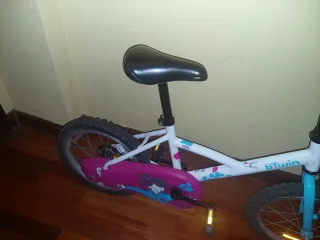 Bicicleta infantil Btwin en color blanco y rosa, ideal para niños de 5 a 7 años. - Cuadro de acero. - Ruedas de 16 pulgadas. - Frenos delanteros y traseros. - Sillín ajustable en altura. - Guardabarros delantero y trasero.