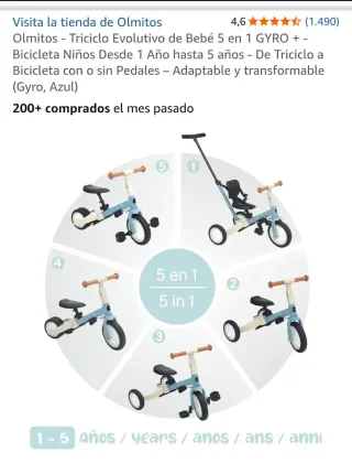 Triciclo evolutivo Olmitos 5 en 1, ideal para niños de 1 a 5 años. Se transforma de triciclo a bicicleta. - Modelo GYRO. - Color Azul. - Adaptable y transformable. - Incluye barra de empuje para padres.