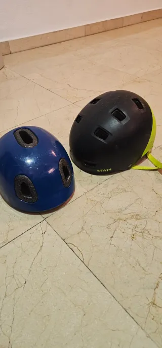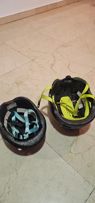 Cascos de protección para bicicleta, uno azul de talla xxs (niño de 4 -5 años) y otro amarillo fluorescente/negro. Ambos con acolchado interior, correas en buen estado. Btwin.