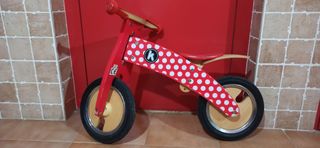 Preciosa bicicleta de madera para niñ@s, sin pedales. Ideal para que los más pequeños desarrollen el equilibrio y la coordinación. - De madera, con un diseño rojo y estrellas blancas. - Llantas grises. - Perfecta para aprender a montar en bici.