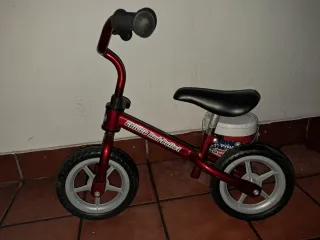Bicicleta de equilibrio roja para niños, modelo Chicco Red Bullet. No te voy a engañar, funciona pero esta llena de golpes, rayones, y el asiento tiene pequeñas roturas. las ruedas tienen marcas claras de desgaste. Aún así, sigue funcionando y nuestro hijo la ha estado disfrutando hasta hace poco. así que la regalamos. Es tuya si vienes a recogerla.