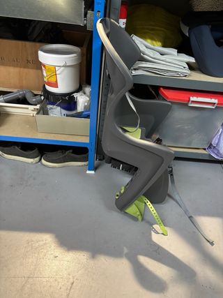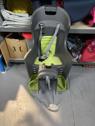 Silla para bicicleta infantil, en buen estado. Ideal para transportar a niños pequeños de forma segura y cómoda. - Se instala fácilmente en la parte trasera de la bicicleta. - Estructura de plástico resistente y duradero. - Incluye arnés de seguridad para el niño. - Color gris y verde.