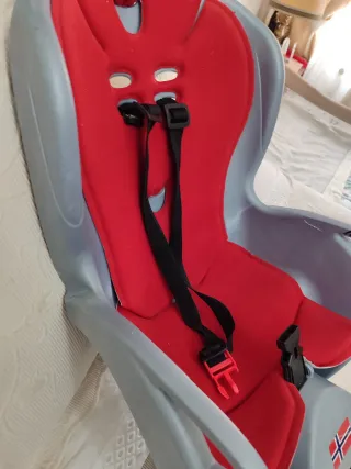 Sillín para bicicleta infantil, usado pero en buen estado. - Ideal para niños. - Color azul y rojo. - Incluye correas de seguridad.