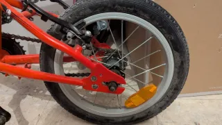 Bicicleta infantil B'Twin de 16 pulgadas en color naranja. - Diseño llamativo con dibujo en el protector de cadena. - Frenos adaptados para niños. - Con timbre incluido. En muy buen estado