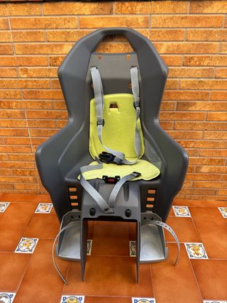 Asiento de seguridad para bicicleta, diseñado para niños. - Color gris oscuro con cojín interior en tono verde claro. - Arnés de seguridad de tres puntos con hebilla. - Correas ajustables para el arnés.