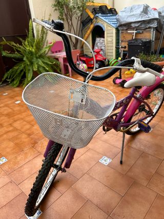 Bicicleta infantil de color morado, ideal para niñas. Cuenta con una práctica cesta delantera. - Cesta de metal. - Manillar negro. - Ruedines no visibles. Una rueda pinchada