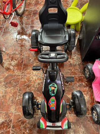 Este go-kart a pedales tiene un diseño deportivo y llamativo, perfecto para los pequeños aventureros. - Asiento ergonómico. - Volante para dirección. - Pedales para propulsión. - Ruedas resistentes.