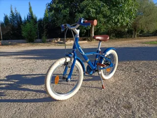 Bicicleta infantil de color azul, en excelente estado. -cuadro de aluminio y muy ligero - Ruedas de 14 pulgadas. - Sillín y puños marrones. - Incluye pata de cabra. -Inclye ruedines -ideal para niños a partir de 4 años -esta completamente nueva