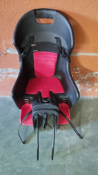 Silla para transportar niños en bicicleta. Ideal para niños y niñas hasta 22kg. Está en buen estado y es de color azul y rojo. - Se fija fácilmente a la bicicleta mediante un soporte en la barra del sillín. - Incluye reposapiés. - Cómodo y seguro para el niño. - Se ancla y desmonta fácilmente mediante un botón al soporte