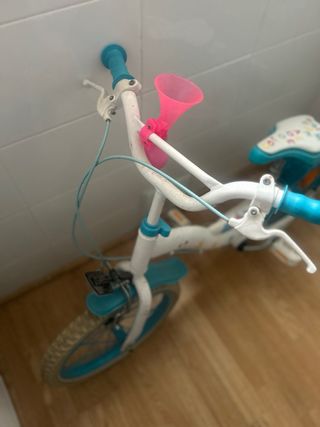 Bicicleta infantil en buen estado, ideal para niños y niñas de 3 a 6 años. - Color blanco y azul. - Sillín con letras. - Incluye timbre rosa.
