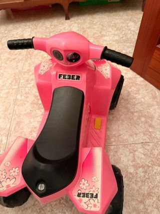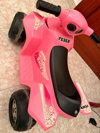 Quad de juguete marca Feber en color rosa, diseñado para niñas. - Diseño tipo quad. - Manillar con puños negros. - Asiento negro. - Detalles decorativos de flores. Muy poco uso! Se puede ver sin compromiso
