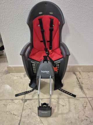 Silla porta niños de la marca Hamax, modelo Smiley. Diseñada para el transporte seguro de los más pequeños en bicicleta. - Color rojo y negro. - Arnés de seguridad de 3 puntos. - Reposapiés ajustables. Tiene un reposapiés sin el enganche, por eso lo vendo más barato. Se ha usado 3 veces.