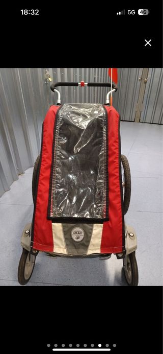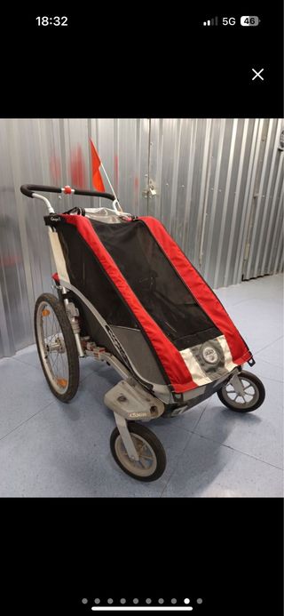 Carrito para bicicleta de la marca Thule, ideal para transportar niños. - Color rojo y negro. - Incluye bandera de seguridad naranja. - Ruedas de gran tamaño para todo terreno. - Rueda delantera giratoria.
