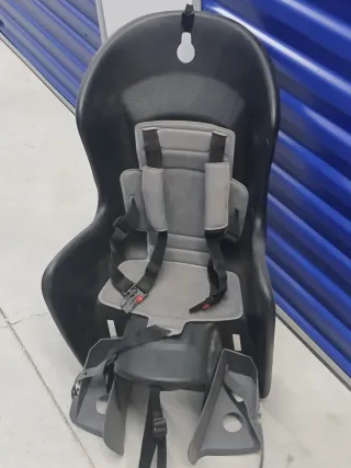 Silla de seguridad para transportar niños en bicicleta. Diseñada para ofrecer comodidad y protección. - Asiento acolchado. - Reposapiés ajustables. - Sistema de sujeción. - Color negro y gris.