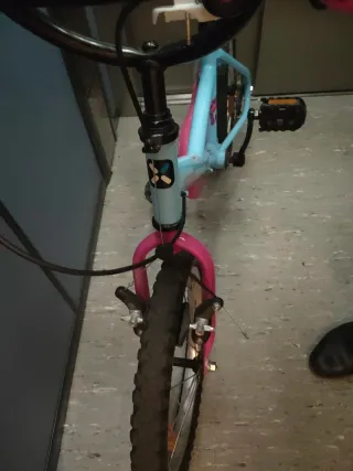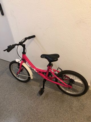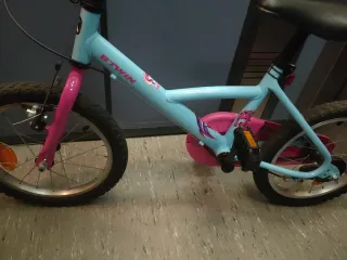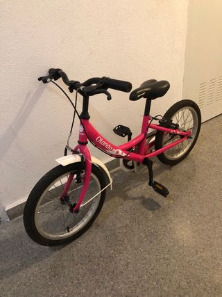 Bicicleta infantil B'Twin 16" rosa con accesorios ¡Ideal para aprender a montar! bicicleta infantil de la marca B'Twin en color rosa, muy bien cuidada. Tamaño: Ruedas de 16 pulgadas. Accesorios incluidos: Cestita trasera portamuñecos, guardabarros y ruedines (estabilizadores) desmontables. Seguridad: Protector de cadena integral con dibujos para evitar enganchones, se regala Luz roja trasera. En perfecto funcionamiento, lista para usar. Perfecta para niños/as que están empezando. Entrega en mano.