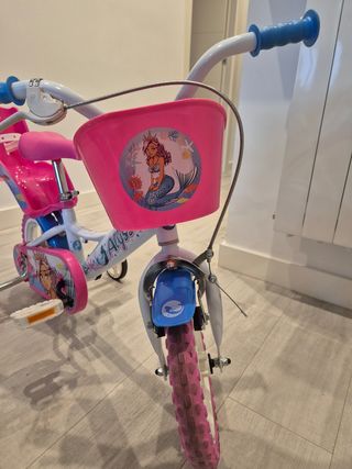Bicicleta infantil de 12 pulgadas en muy buen estado con motivos de sirenas. - Freno delantero - Color principal blanco con detalles en rosa y azul. - Canasta delantera rosa. - Asiento trasero para muñeca o peluche. - Ruedines de apoyo incluidos.