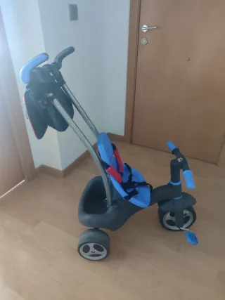 Triciclo infantil con asiento y manillar. - Asiento azul con arnés de seguridad. - Manillar azul. - Ruedas negras.