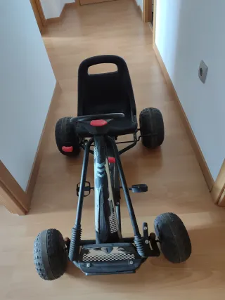 Kart a pedales de color negro, diseñado para niños entre 3 y 8 años. Muy fuerte y seguro. Está como nuevo. Muy poco uso. - Número 8 en la parte frontal. - Diseño deportivo. - Ruedas de goma. - Volante. - Pedales.