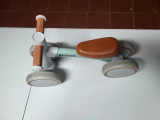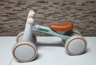 Bicicleta de equilibrio para niños con diseño moderno y divertido. Ideal para los primeros paseos y el desarrollo del equilibrio. - Marco blanco y verde menta. - Asiento marrón. - Ruedas blancas con detalles naranjas. - Nombre de la marca 'SEREED'. Está muy bien cuidada, solo las ruedas un poco sucias del uso.