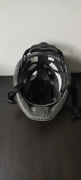 Casco para niñ@, en buen estado. Ideal para proteger la cabeza de tu hij@ mientras disfruta de sus paseos en bicicleta. Talla S =53/57 cm. Incluye las esponjas para ajustar en tamaño y algunas pegatinas para su decoración. - Diseño infantil con estampado de dinosaurio. - Color blanco con detalles azules.