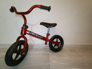 Bicicleta de aprendizaje para niños pequeños, modelo Chicco Red Bullet. - Marco de metal rojo. - Asiento negro. - Manillar con puños negros. - Ruedas plateadas.