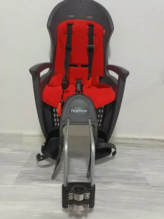 Sillita de seguridad para bicicleta marca Hamax, modelo Smiley. Diseñada para el transporte de niños. - Color rojo y negro. - Arnés de seguridad. - Soporte metálico para montaje.