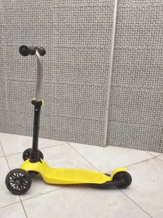 Patín de tres ruedas en color amarillo, diseñado para niños. - Plataforma antideslizante. - Ruedas de goma. - Manillar ajustable.
