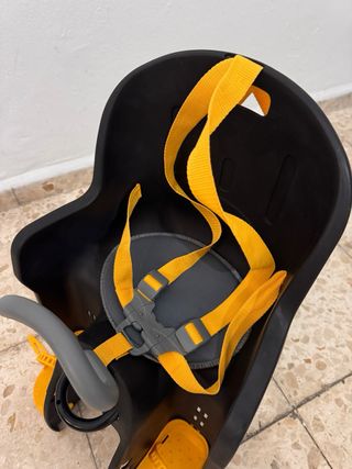 Silla de seguridad para bicicleta, diseñada para la parte delantera. - Color negro y amarillo. - Incluye arnés de sujeción. - Reposapiés ajustable.