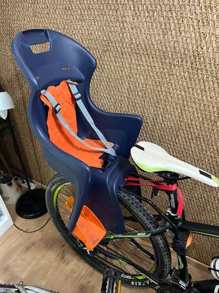 Silla para transportar niños en bicicleta. Es de color azul con detalles naranjas y cinturón de seguridad. Máximo 22 kilos - Asiento acolchado. - Respaldo alto. - Reposapiés.
