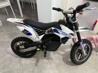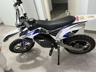 Moto de motocross infantil a batería, ideal para los más pequeños. Baterías nuevas Casco - Diseño deportivo en blanco y azul. - 3 velocidades - Ruedas todoterreno.