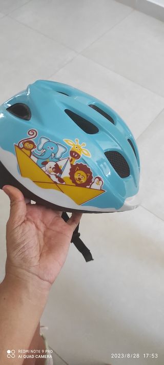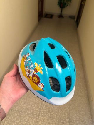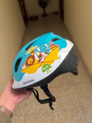 Casco de bicicleta para niños de la marca Btwin, talla XS (46-53 cm). Está como nuevo y es de color azul con dibujos de animales. - Talla XS para niños y niñas. - Diseño infantil con animales. - Marca Btwin. - Ajustable. - Muy poco uso. Está como nuevo.