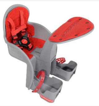 Silla para niño/a para bicicleta, con portabultos universal. - Asiento acolchado. - Cinturones de seguridad. - Reposapiés ajustables.