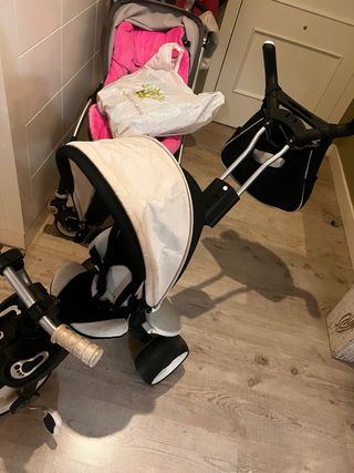 Triciclo evolutivo en color rosa y negro, ideal para acompañar el crecimiento del niño,desde los 10 meses. - Asiento acolchado con arnés de seguridad de 5 puntos. - Capota protectora. - Reposapiés. - Cesta de almacenamiento. - Asiento giratorio 180° - Plegable -Estructura ligera y facil montaje. - Doble freno. -Manillar regulable - peso 10.3 kg Tiene muy poco uso como se puede ver en las fotos está prácticamente nuevo. Medidas y mas características en fotos.