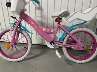 Bicicleta infantil de 16 pulgadas en color rosa. Apenas dos o tres salidas, sin uso prácticamente. - Marca WST. - Sillín blanco con detalles rosas. - Ruedas negras con llanta de aluminio. - Cadena protegida con cubre cadena negro y rosa.