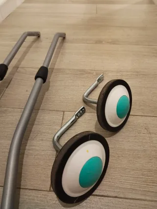 Set de ruedines para bicicleta de niño, ideales para aprender a montar. - Dos ruedas blancas con borde negro. - Dos tapas negras para los ejes. - Soportes metálicos en forma de L. - Tornillos y arandelas para su montaje.