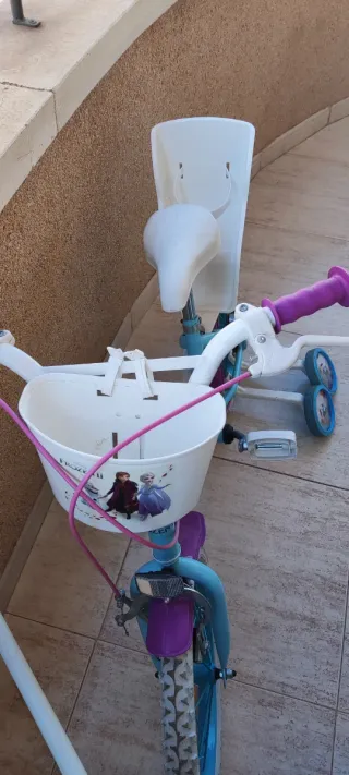 Bicicleta infantil con temática de Frozen, ideal para las primeras aventuras sobre ruedas. Diseñada para la diversión y el aprendizaje. - Color azul y morado. - Ruedines incluidos. - Cesta delantera. - Guardabarros.