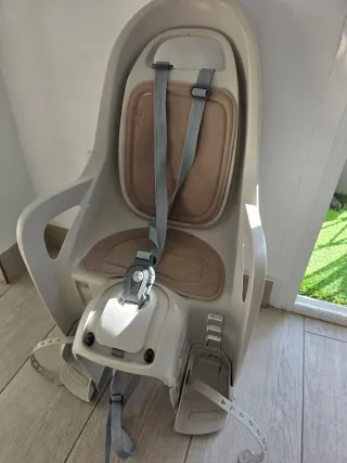 Sillín de seguridad para bicicleta, diseñado para transportar niños pequeños de forma segura. - Cinturón de seguridad de 3 puntos. - Reposapiés ajustables. - Diseño ergonómico para mayor comodidad. - Material de plástico resistente.