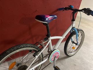 Bicicleta Btwin Infantil/Juvenil – Buen estado general Se vende bicicleta marca Btwin, ideal para niños o jóvenes. Ruedas de 24”, con cuadro en color beige y detalles morados con dibujos florales. Perfecta para paseos urbanos o para iniciarse en el ciclismo. 🔧 Características: • Cuadro resistente y ligero • 6 velocidades (cambio trasero) • Guardabarros delantero y trasero • Timbre funcional • Ruedas en buen estado ⚠️ Detalles a tener en cuenta: • Tiene algunas partes con óxido superficial (ver en la cadena y cambio) • Neumáticos con algo de desgaste, pero funcionales 📍 Se puede ver sin compromiso. Ideal como bici de repuesto o para quien quiera iniciarse sin hacer una gran inversión. Precio negociable. ¡Pregúntame sin compromiso!