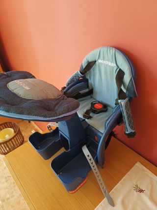 Silla para transportar a un niño en bicicleta. Es de color gris y cuenta con cinturón de seguridad. - Asiento acolchado. - Sistema de sujeción. - Material resistente.