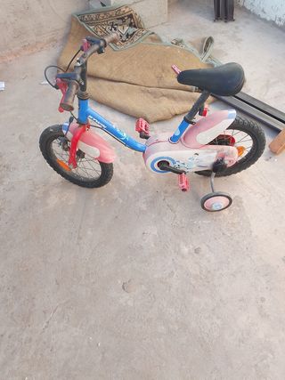 Bicicleta para niña, de 16 pulgadas, usada. Está en buenas condiciones, aunque muestra señales de uso. - Marca: Btwin - Color: Azul y rosa - Ruedines incluidos