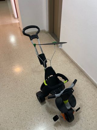 Triciclo infantil, ideal para paseos al aire libre. - Asiento acolchado con arnés de seguridad. - Capota protectora en color rojo Extraíble.