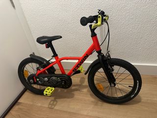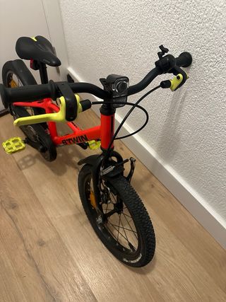 Bicicleta infantil Btwin de 14 pulgadas, ideal para los más pequeños. Su color rojo la hace muy visible y atractiva. - Ruedas de 14 pulgadas. - Frenos adaptados para niños. - Diseño Btwin. solo tiene dos meses. se le ha quedado pequeña rápido. Tiene ruedines también.