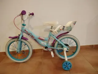 Bicicleta infantil con temática de Frozen, ideal para las pequeñas de la casa. Cuenta con un diseño divertido y colorido. Está en perfecto estado, revisada y reparada para que esté en perfecto estado de usarse. Precio no tan negociable - Color principal azul claro y morado. - Incluye ruedines para facilitar el aprendizaje. - Asiento y cesta trasera decorados.