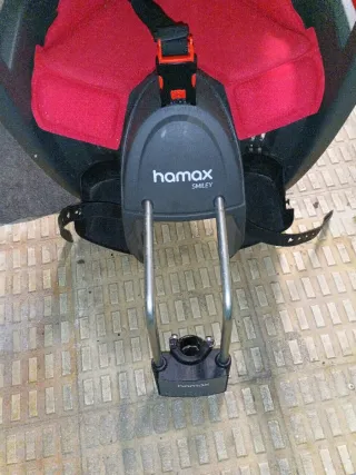 Silla HAMAX para transportar niños en bicicleta. Diseñada para ofrecer seguridad y comodidad. - Asiento acolchado. - Arnés de seguridad de 3 puntos. - Hebilla de cierre rojo. - Estructura de plástico resistente.