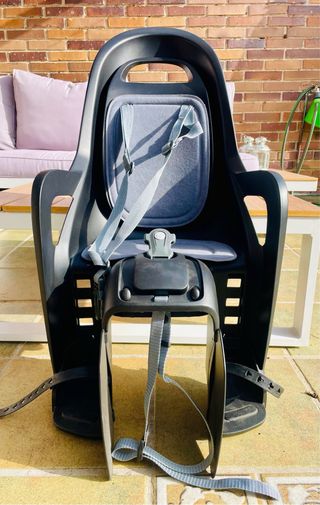 Silla de seguridad para transportar niños en bicicleta. Fabricada en plástico resistente y con arnés de sujeción. - Color negro. - Arnés de seguridad de 3 puntos. - Reposapiés ajustables.
