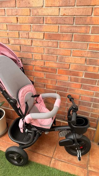 Triciclo evolutivo Kinderkraft Aston en color rosa. Diseñado para acompañar el crecimiento del niño. - Estructura robusta. - Asiento cómodo y acolchado. - Capota para protección solar. - Barra de seguridad. - Reposapiés. - Cesta de almacenamiento.