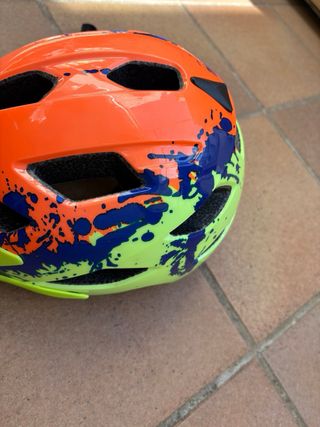 Casco de bicicleta para niño con un diseño llamativo. - Color principal naranja con detalles en amarillo y salpicaduras azules. - Visera integrada. - Sistema de ajuste con correas.